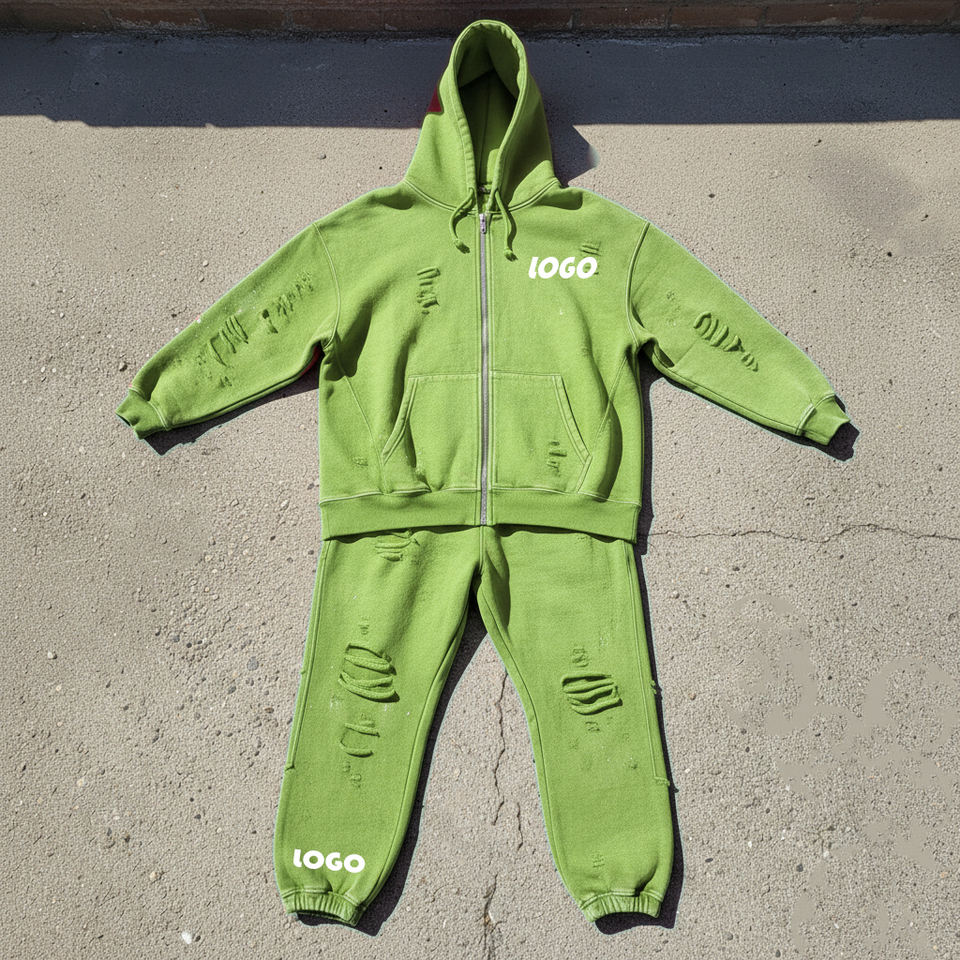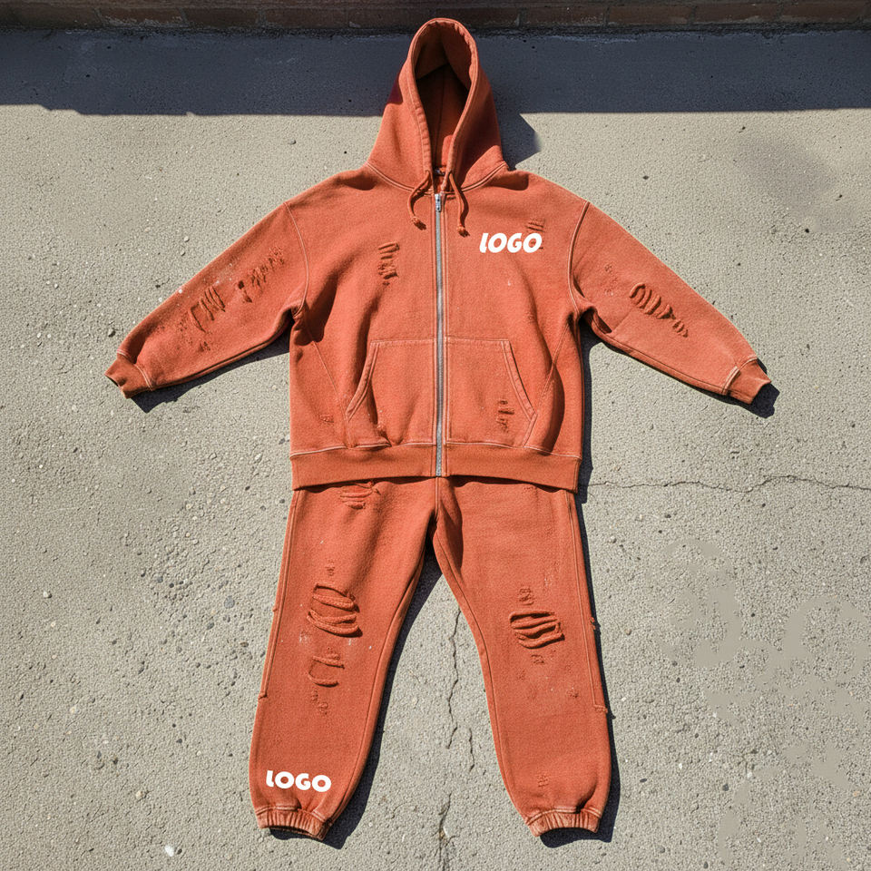 Conjunto de Sudadera con Capucha y Cremallera Estilo Vintage con Logotipo Personalizado y Pantalones Deportivos Holgados, 100% Algodón, Estilo Desgastado, para Hombre