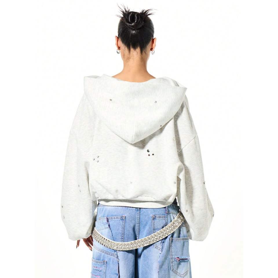 Sudadera con Capucha Extra Grande con Cierre y Logotipo Personalizado, Sudadera Informal de Moda para Mujer con Pedrería Metálica, Sudadera de Invierno de Alta Calidad con Ojales