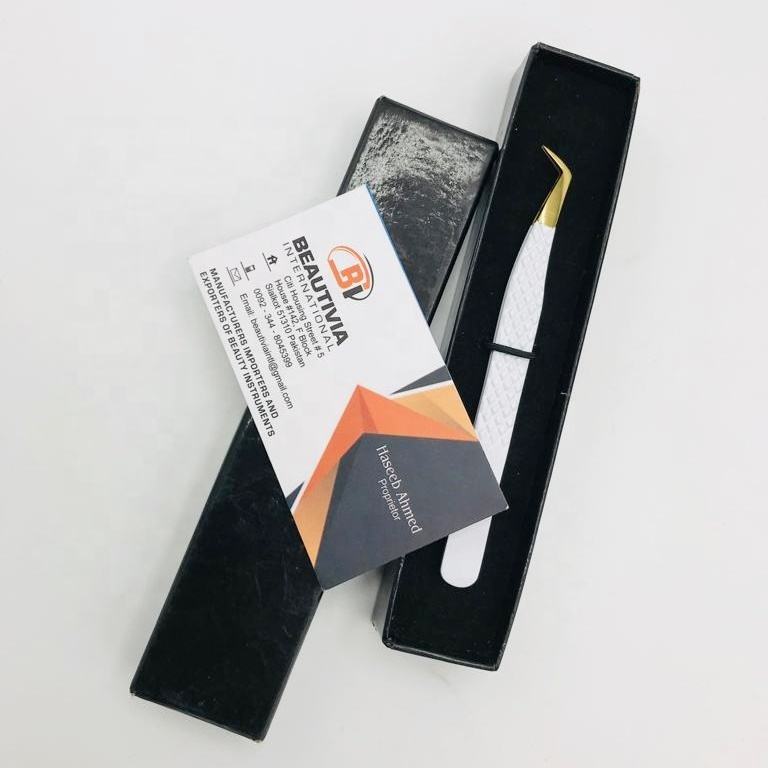 Pinzas de extensión de pestañas de acero inoxidable de 65 grados con logotipo personalizado, Punta puntiaguda con agarre fuerte y pinzas de pestañas de fibra blanca