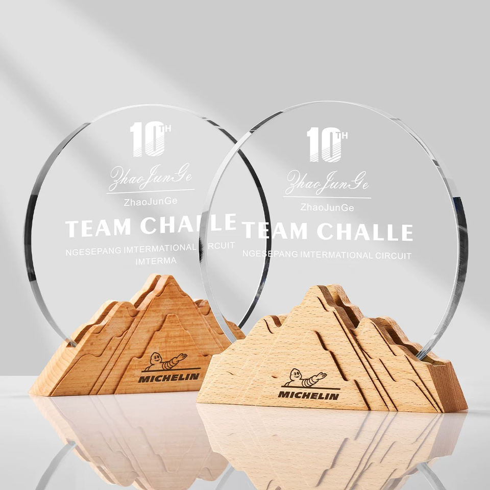 Logotipo personalizado Base en forma de montaña de madera Trofeo de cristal redondo Empresa Aniversario Recuerdo Premio de madera