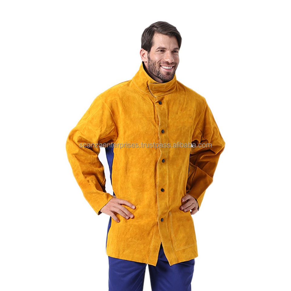 Chaqueta de Soldadura Unisex de Cuero Vacuno Amarillo Marrón con Logotipo Personalizado, Protección de Nivel, Resistente al Fuego, a la Radiación y al Calor