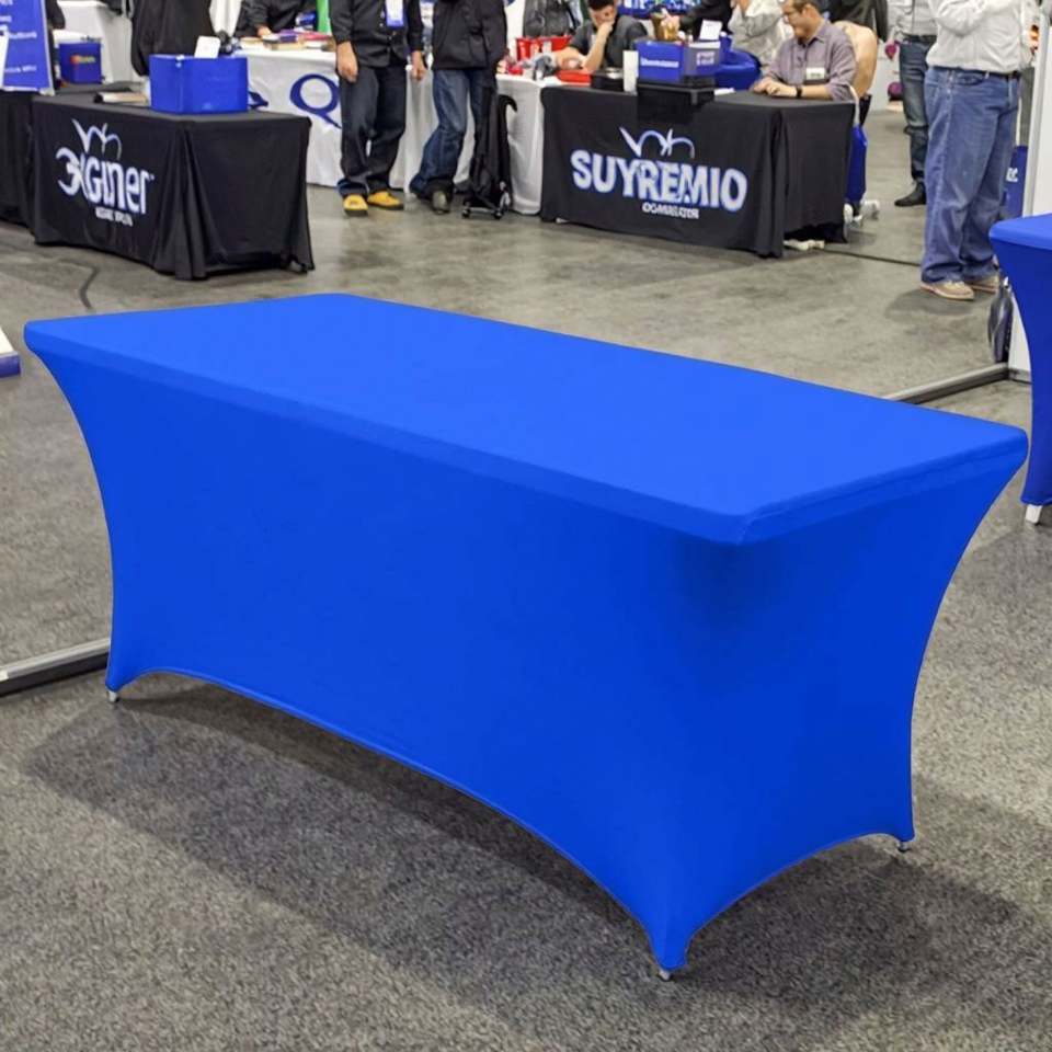 Funda de Mesa Plegable Larga Personalizada de Spandex Resistente con Diseño de Impresión Digital en Azul para Mesas de Eventos, Ferias Comerciales y Stands de Vendedores
