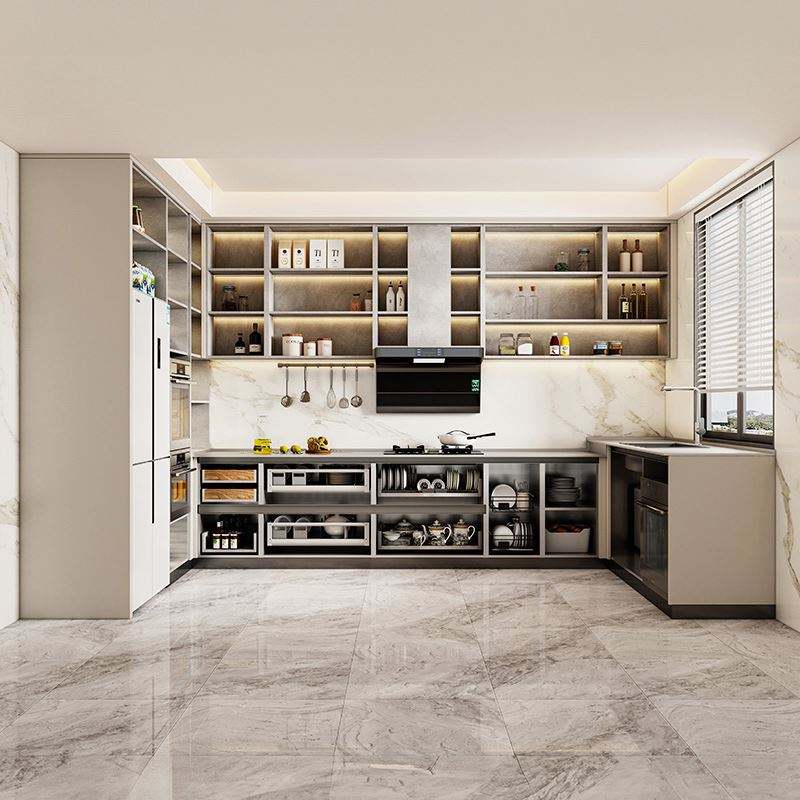 Gabinetes de Cocina de Estilo Europeo de Lujo Personalizados | Juego de Muebles de Cocina Moderno Completo con Isla, Puertas de Vidrio y Alacena Alta