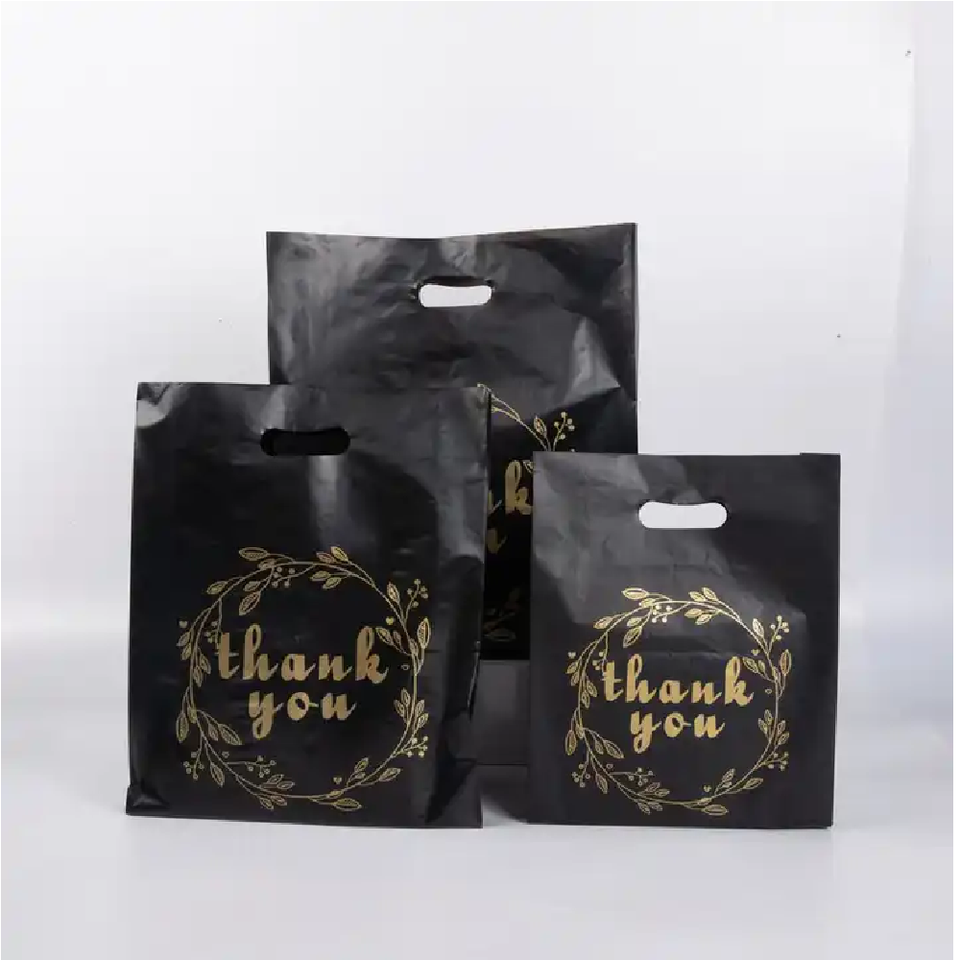 Bolsas de regalo de lujo personalizadas Bolsa de compras de plástico LDPE biodegradable Blanco Negro Mango troquelado Gracias Bolsas de embalaje al por mayor