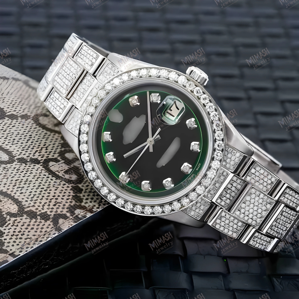 Reloj Hip Hop de lujo personalizado con esfera verde, pantalla de fecha, caja de acero inoxidable, adornos de diamantes de moissanita