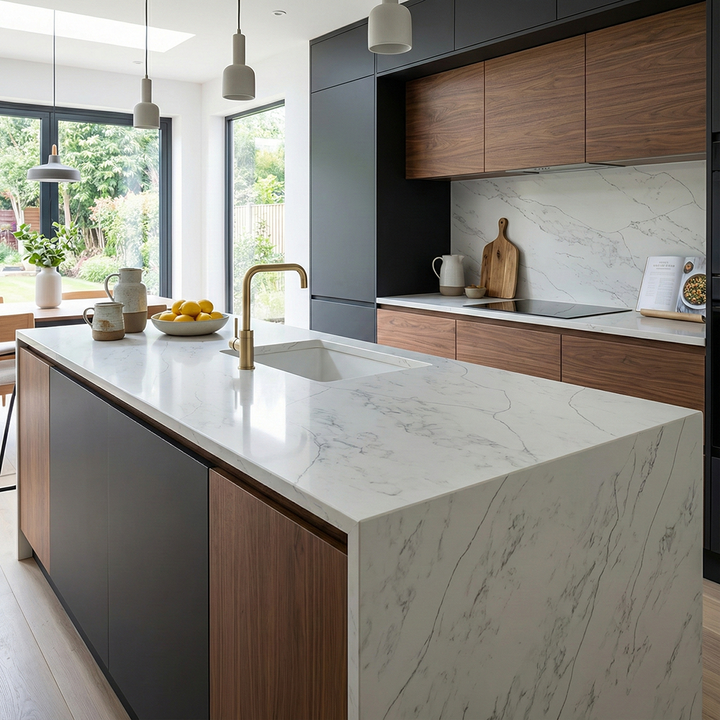 Losa de Cuarzo Blanco Calacatta con Aspecto de Mármol Natural de Lujo Personalizado, con Vetas Grises, para Mesa de Comedor, Tocador, Superficie de Isla con Cascada
