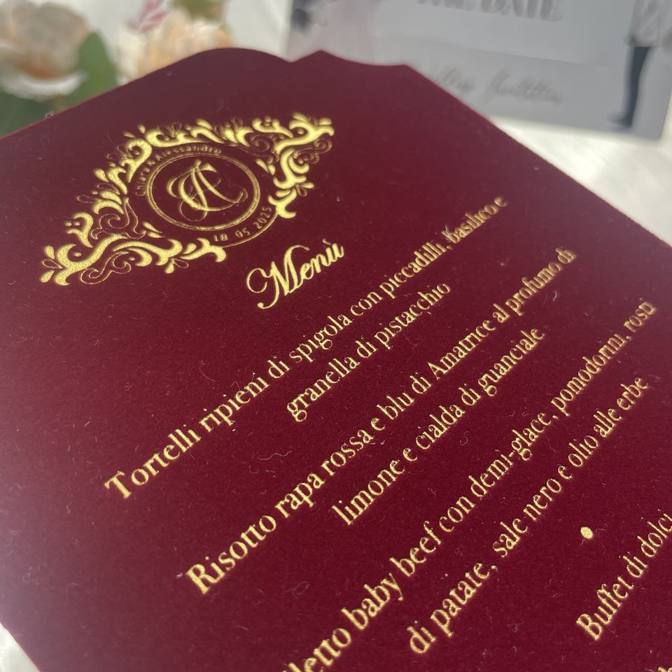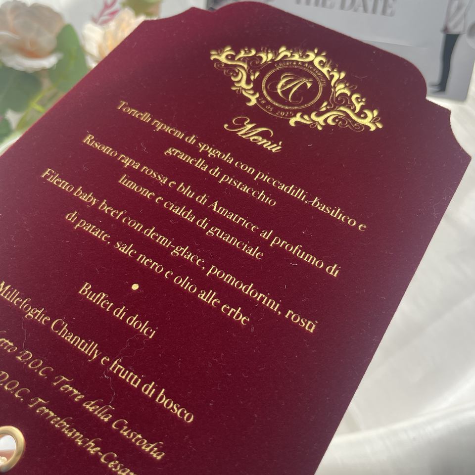 Diseño de menú de terciopelo de lujo personalizado con lámina de estampado dorada con borla boda noche lámina de oro tarjetas de menú de lugar de mesa de terciopelo