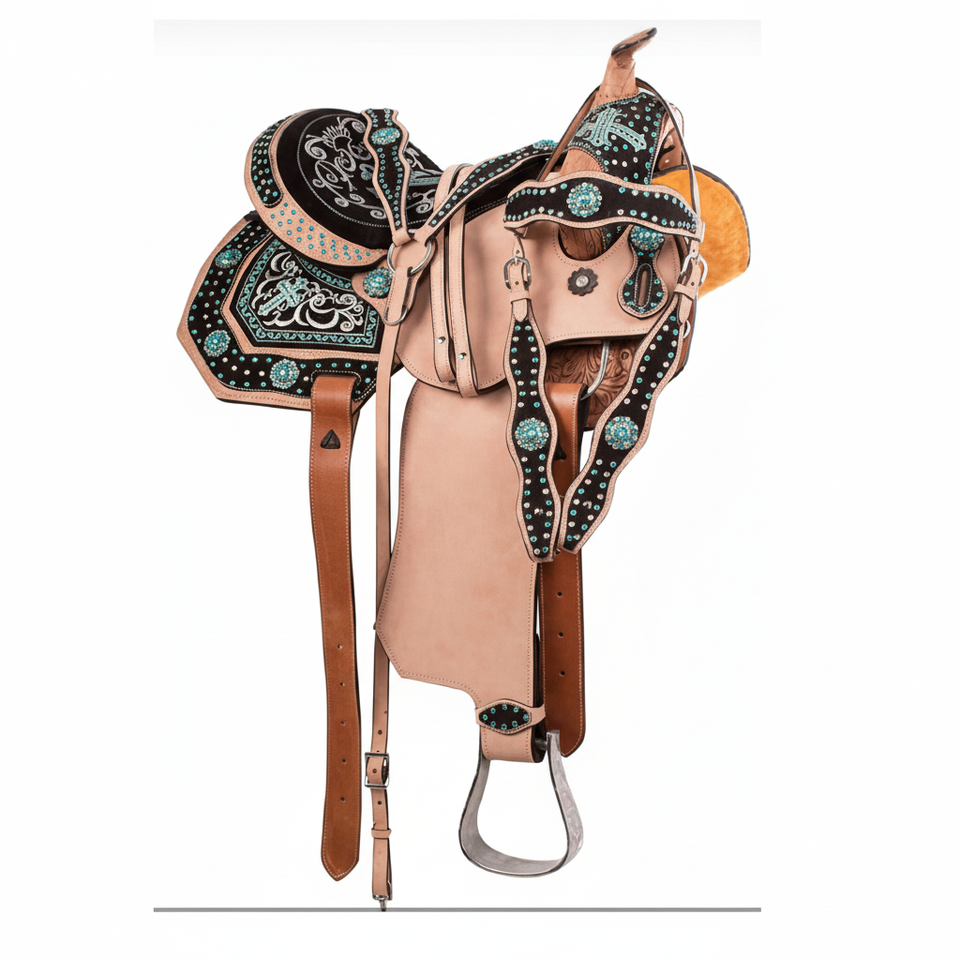 Silla de montar inglesa australiana de cuero de conífera ecológica hecha a medida, silla de montar islandesa con patrones en relieve y diseños adornados, personalizada