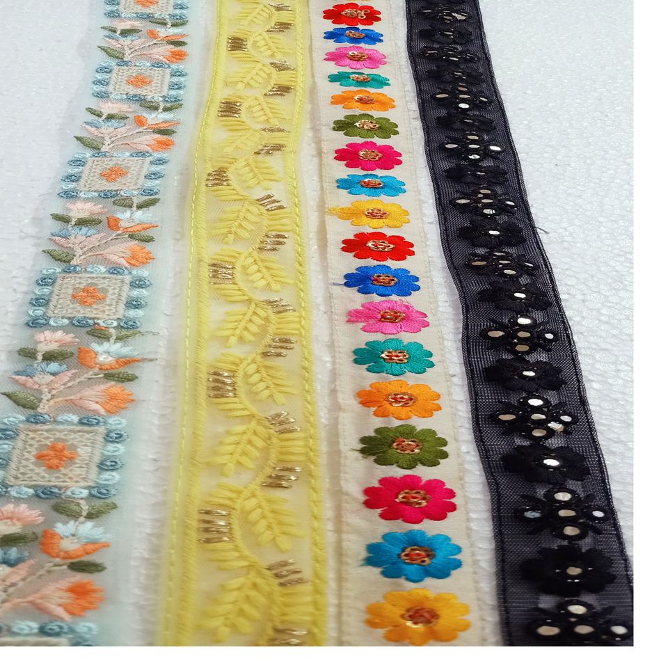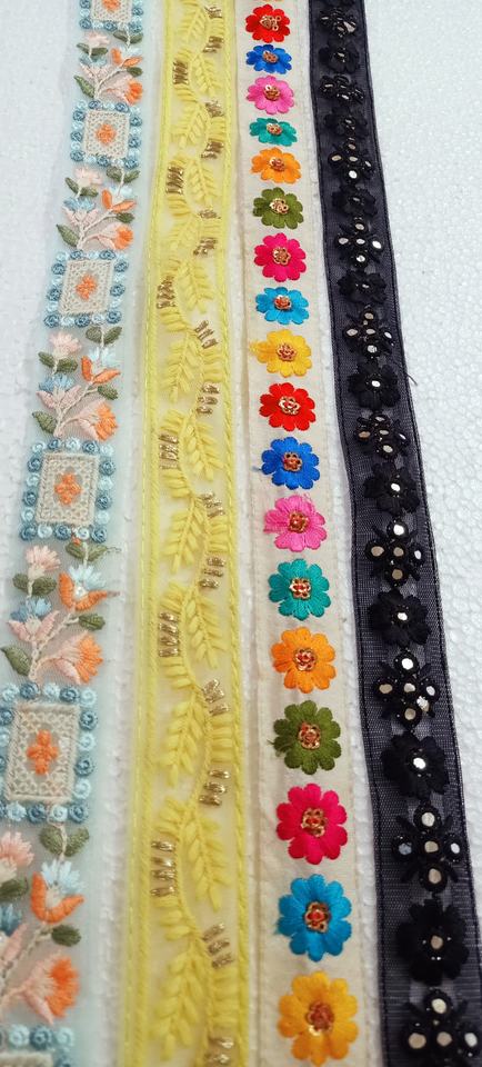 Bordado floral hecho a medida en formas multicolores en diseños étnicos para diversos fines en diferentes tamaños en tela de red.