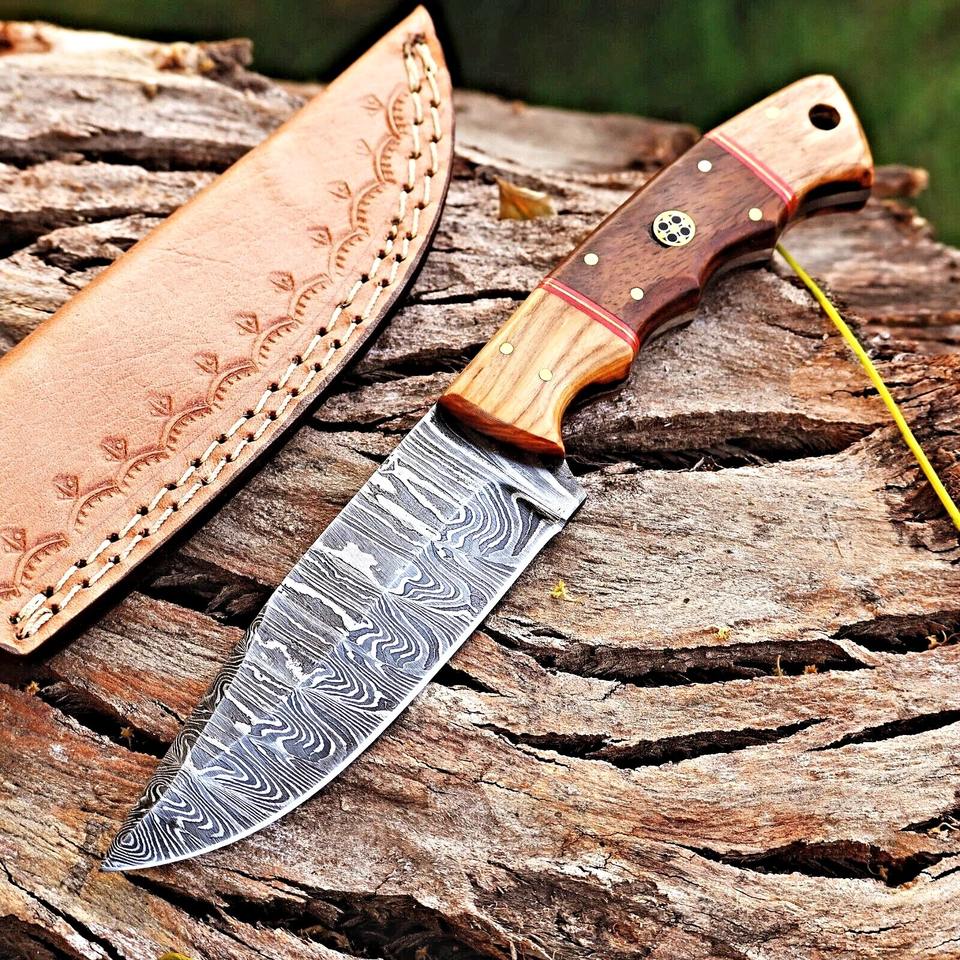 Hoja de acero de Damasco forjada a mano hecha a medida, cuchillo de caza para acampar, funda, soporte OEM, hoja fija, cuchillo para acampar, grado Industrial