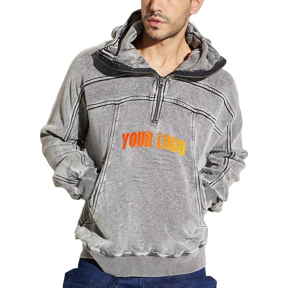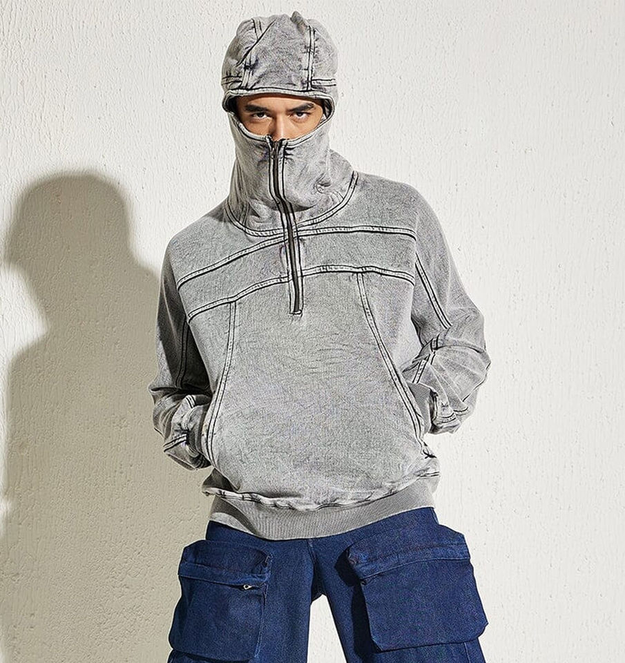 Sudadera con Capucha Ninja Personalizada de Corte Cuadrado y Media Cremallera para Hombre, Lavada al Ácido, Extragrande, con Pasamontañas, Sudaderas Únicas
