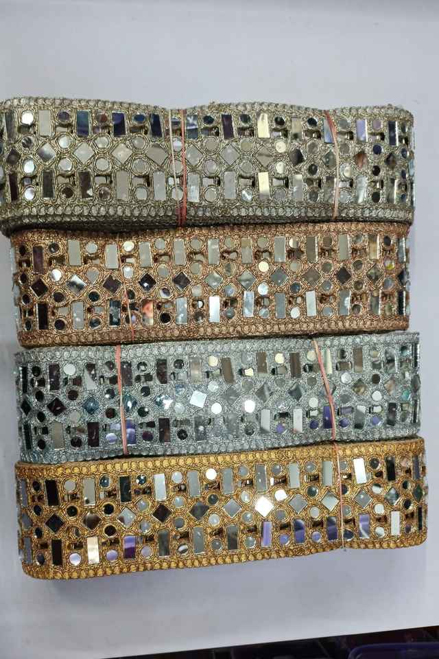 Cintas de gama alta hechas a medida, máquina de trabajo de espejo bordada en diseños geométricos, cuatro colores en tafetán para vestidos