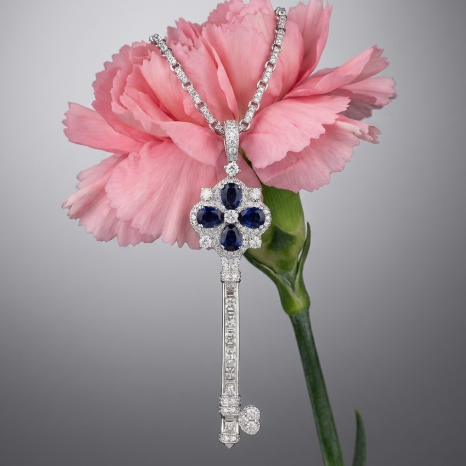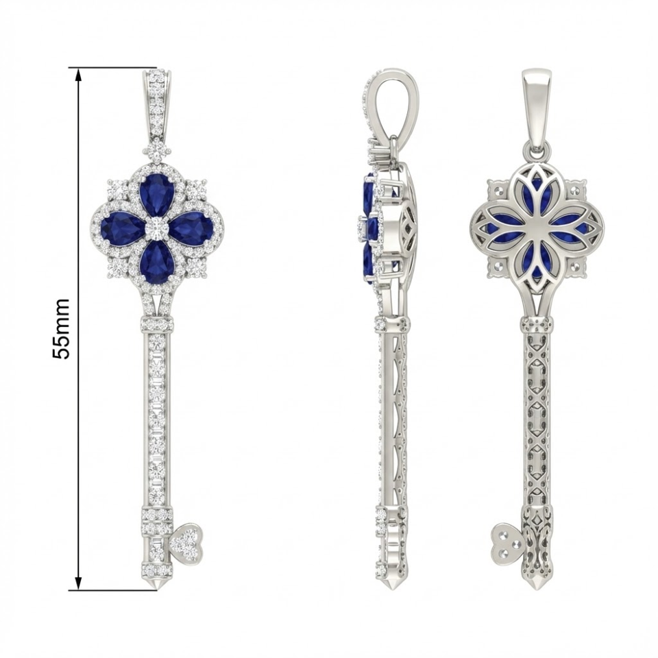 Joyería Hecha a Medida con Logotipo, Colgante Clásico en Forma de Llave de Oro Blanco Sólido de 18K de la Mejor Calidad con Zafiro para Fiesta de Mujer