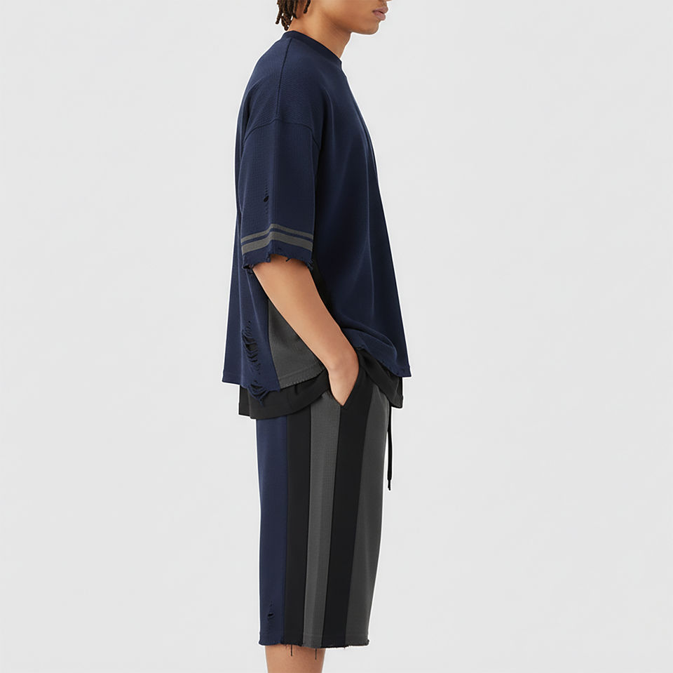 Conjunto de 2 piezas de camiseta y pantalones cortos de verano, hecho a medida, de corte holgado, con paneles de bloques de color y efecto rasgado, estilo oversize y desgastado