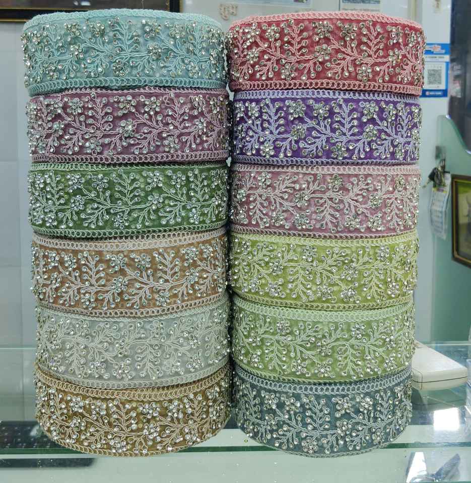 Cintas y cordones bordados a máquina hechos a medida en varios diseños y en doce colores para vestidos de novia en 2 pulgadas de ancho.