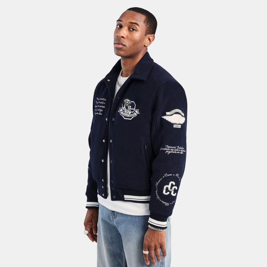Chaqueta universitaria hecha a medida para hombre, cuerpo de lana, Mangas de lana, parches de chenilla bordados, estilo de béisbol Varsity Letterman, Parte delantera larga