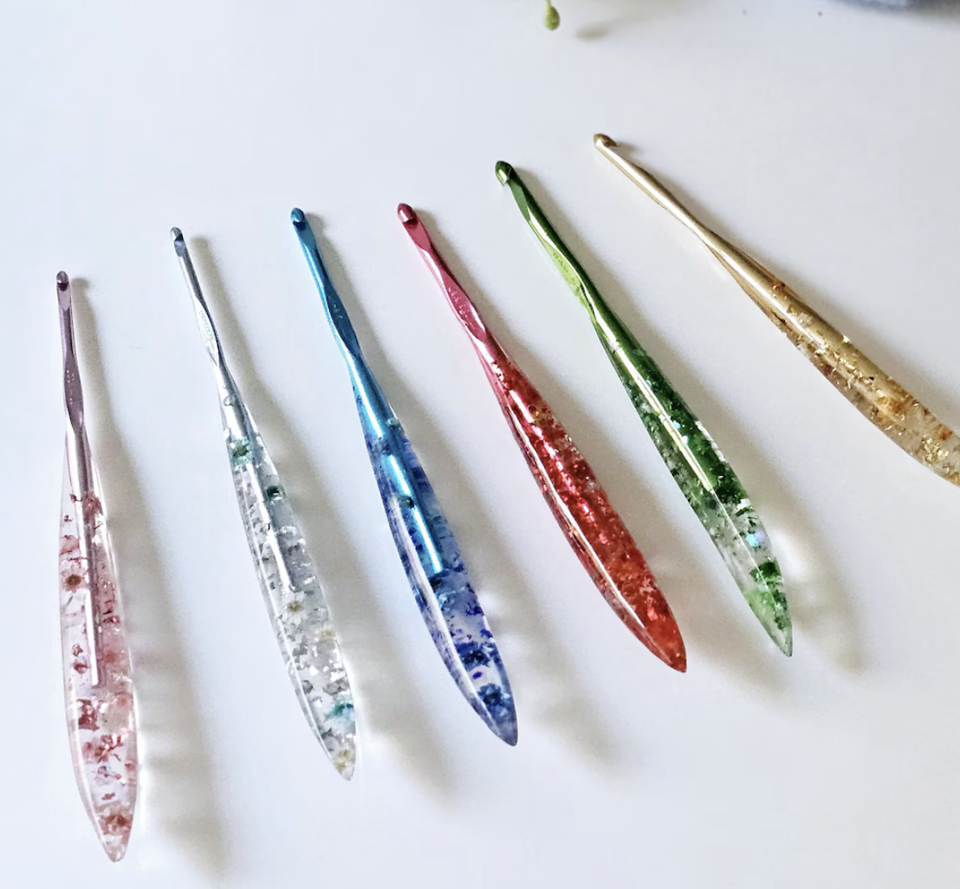 Ganchos de ganchillo de resina hechos a medida en colores surtidos con brillantina, disponibles a partir de 3.5 mm, ideales para la reventa desde India.