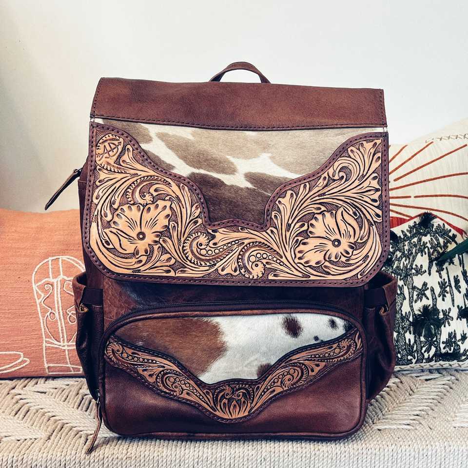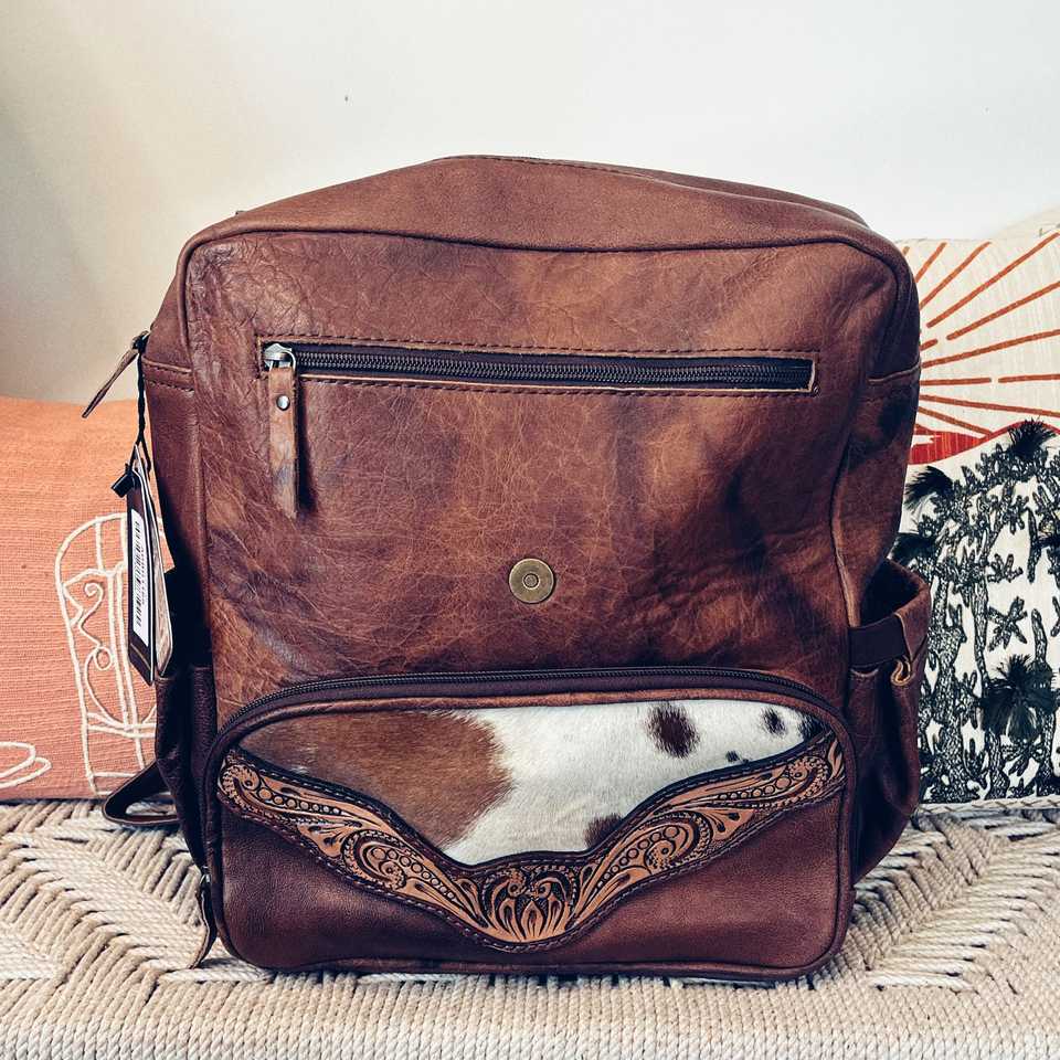 Mochila de Viaje Unisex Estilo Western Rodeo International Hecha a Medida, Cuero Vacuno Natural, Estampado Animal Vintage, Cierre de Cremallera