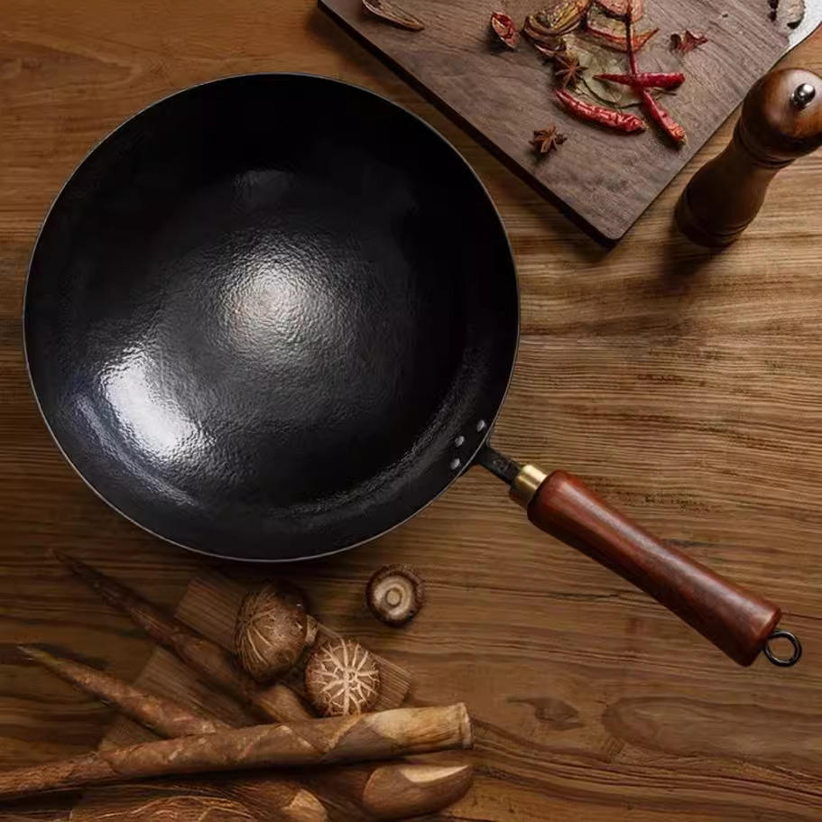 Wok Redondo Antiadherente Hecho a Medida, Estilo Maestro, Hierro Grueso Martillado, Proceso de Nitruración de 5 Capas, Solo Lavar a Mano