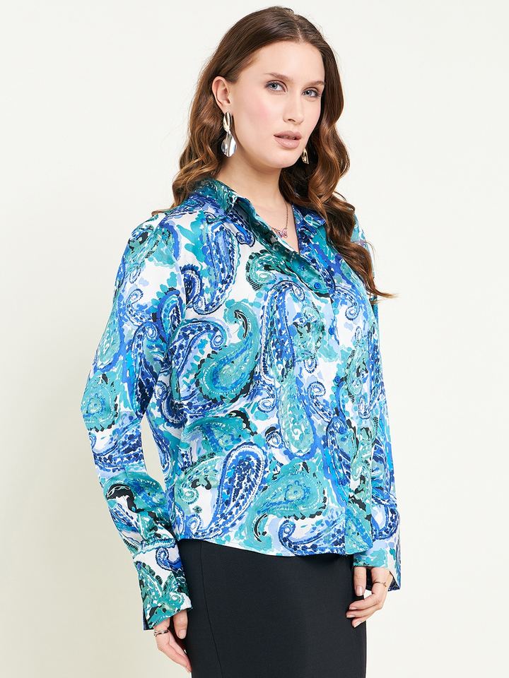 Camisa con botones en la parte delantera de manga completa con estampado de Cachemira multicolor satinado hecha a medida adecuada para clientes boutique y revendedores de prendas