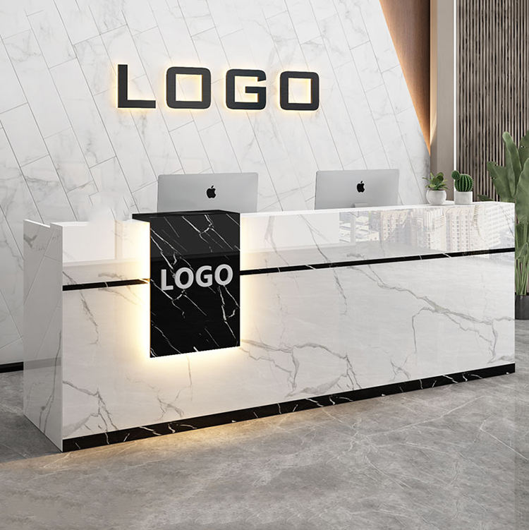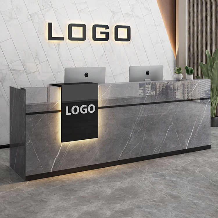 Escritorio de recepción LED de madera hecho a medida, diseño de salón de belleza con pared trasera, escritorio de recepción de cliente