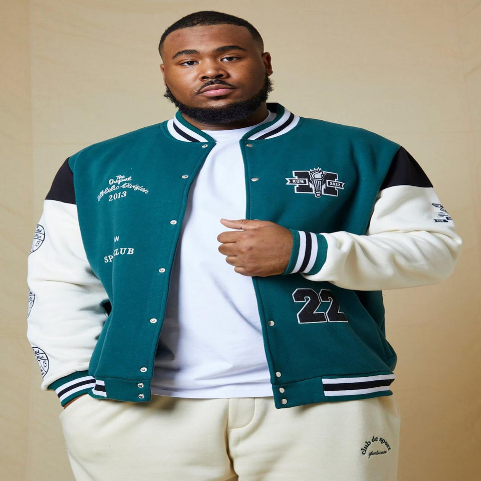 Chaqueta universitaria hecha a medida para hombre, chaqueta universitaria de retazos de tela suave y cómoda con botones de béisbol para hombre