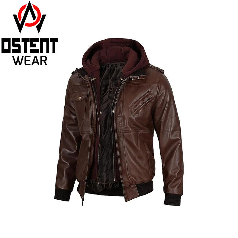 Venta al por mayor de chaqueta de piel de cordero marrón por encargo para los hombres de estilo universitario con cuello alto logotipo personalizado mangas de cuero capucha