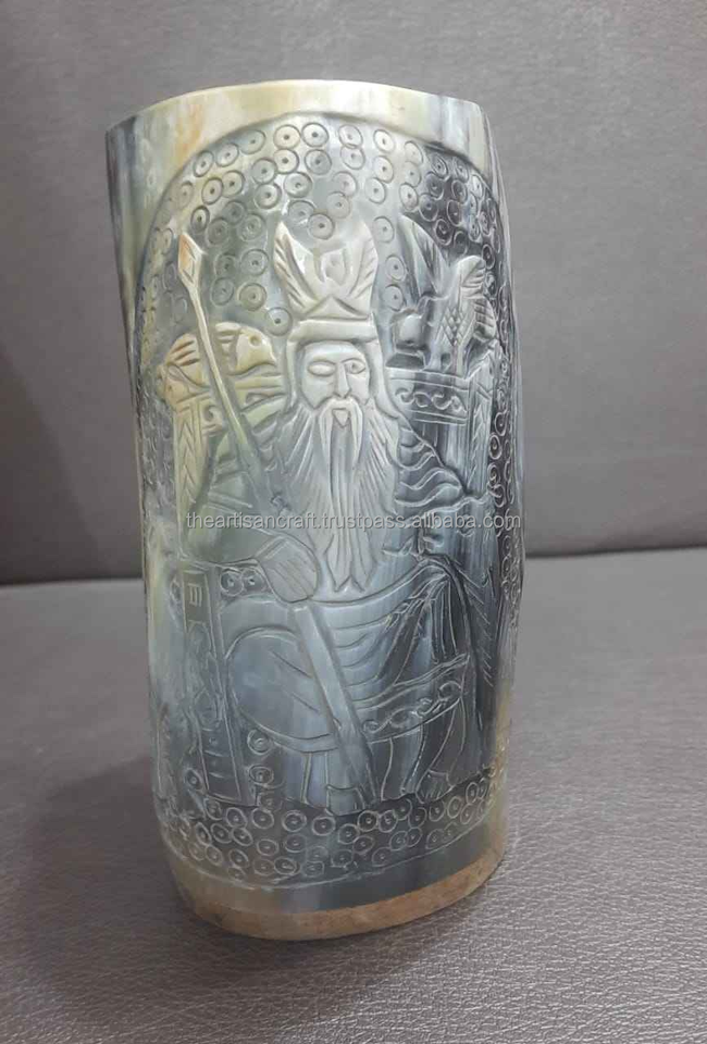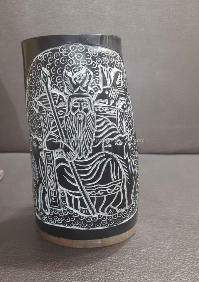 Taza de cuerno para beber tallada a mano con diseño de dragón hecho a medida con intrincadas tallas de tema vikingo para tienda de suministros de hidromiel y vikingo