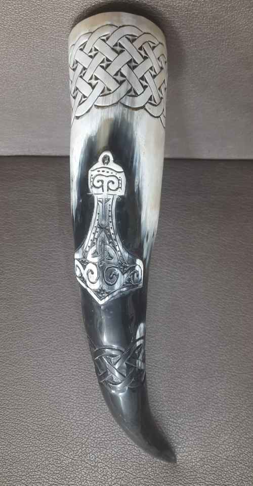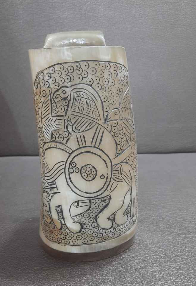 Taza de cuerno para beber tallada a mano con diseño de impresión blanca hecha a medida con tallas de tema vikingo para tiendas de suministros de hidromiel y vikingos.