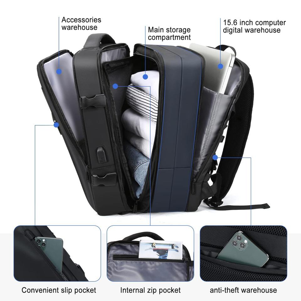 Mochila de Viaje para Portátil de Negocios, Expandible, Impermeable, con Carga USB, Logotipo Personalizado, Fabricante Personalizado, para Hombre y Mujer