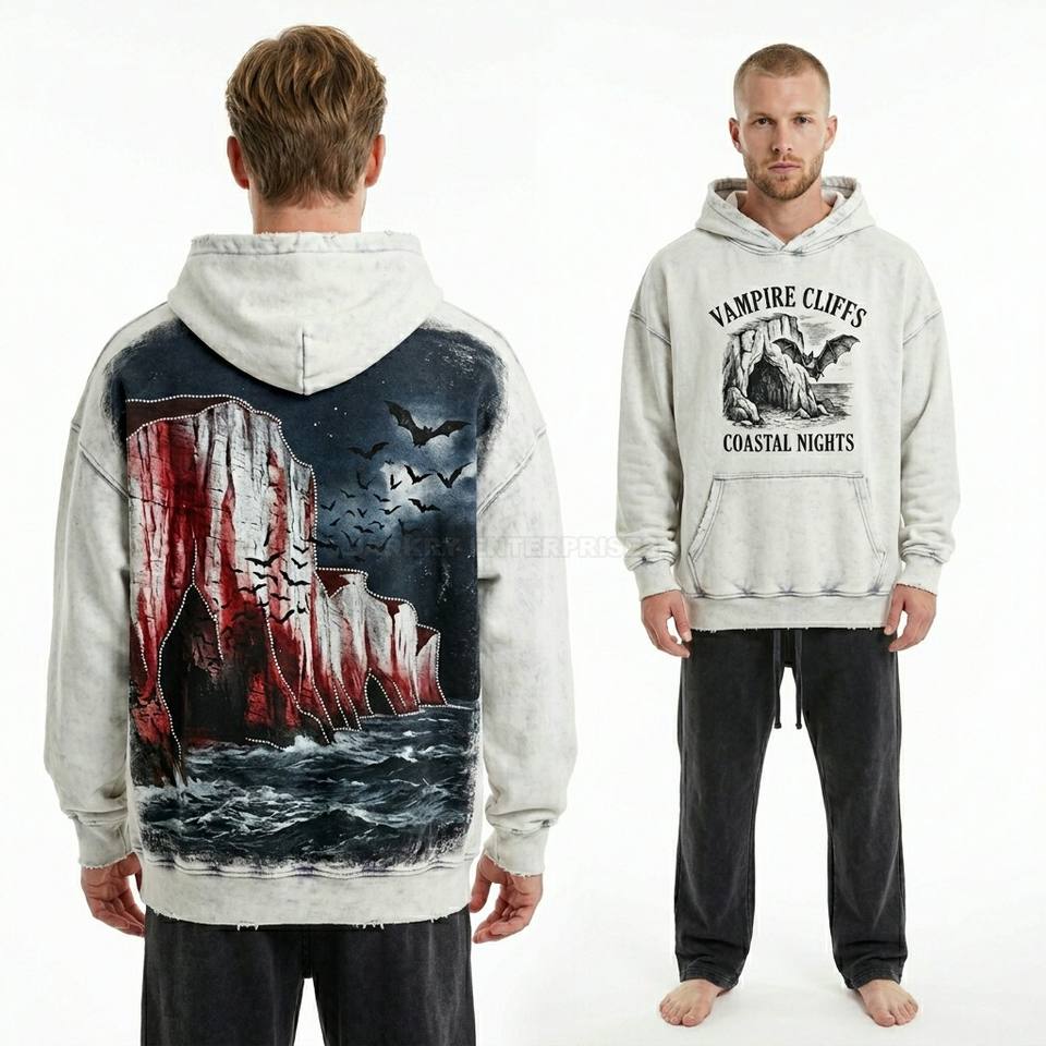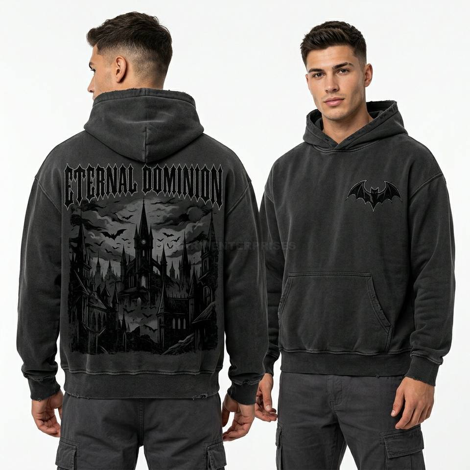 Sudadera con Capucha Extra Grande Color Rojo Granate Personalizada con Estampado Gráfico de Castillo de Vampiros, Estilo Vintage para Hombre, Fabricada en Felpa Francesa