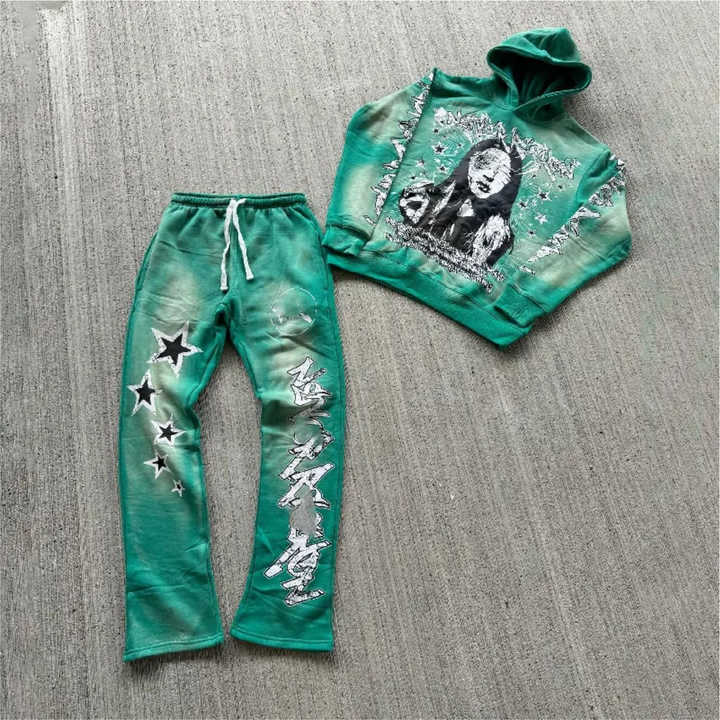 Chándal lavado con ácido personalizado para hombre Sudadera con capucha y pantalones de chándal con estampado DTG lavado al sol desteñido vintage