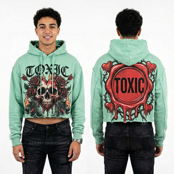 Sudadera con capucha corta verde para hombre, con lavado ácido, gráfico de calavera y rosa, estilo streetwear, con efecto desgastado y bajo sin rematar, de forro polar, personalizada, fabricante
