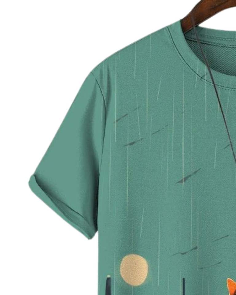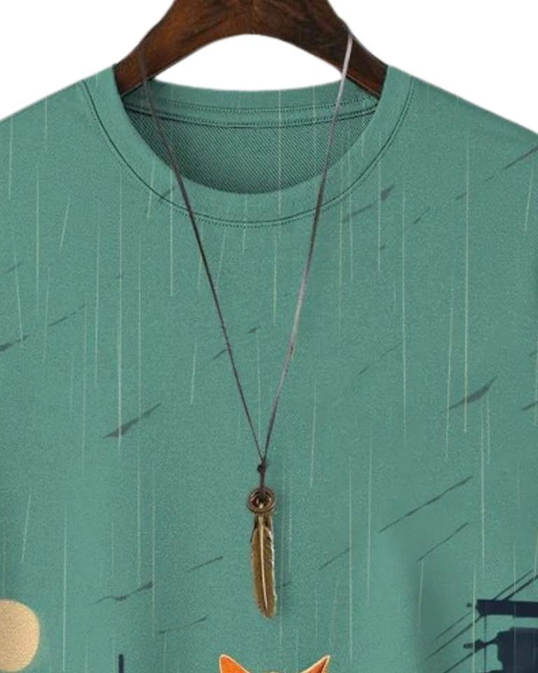 Camiseta Personalizada para Hombre con Estampado Gráfico de Gato Verde, Ropa Urbana Artística de Algodón, Manga Corta, Casual, Holgada, Estilo Urbano, Escena Nocturna, Moda