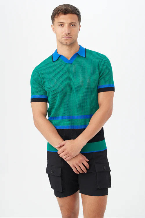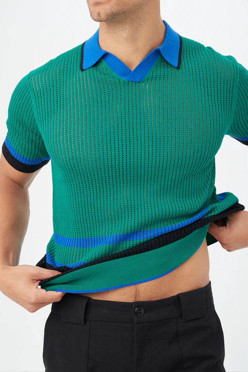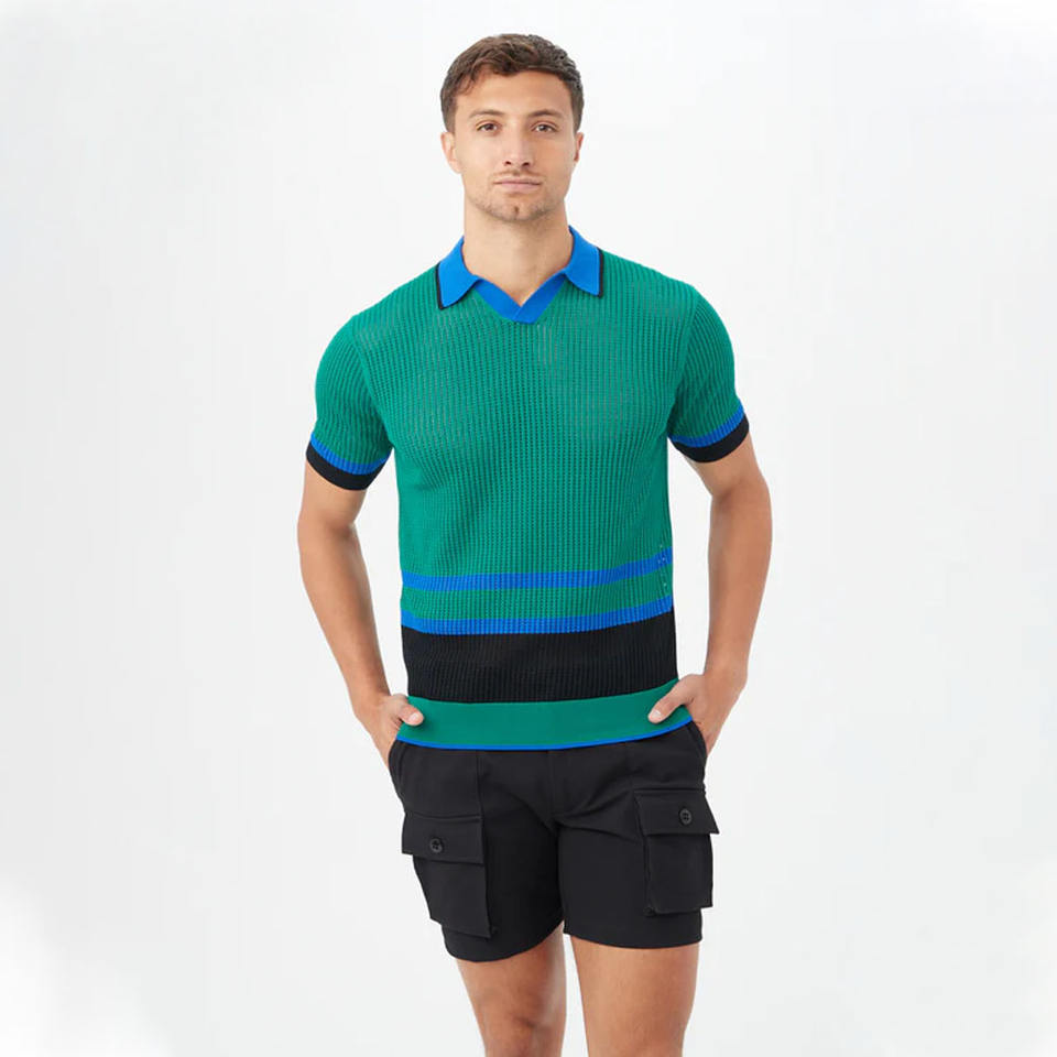Polo de punto calado de Jacquard personalizado para hombre, sudadera de manga corta, suéter de punto de Color contrastante para hombre, camiseta Polo de Golf