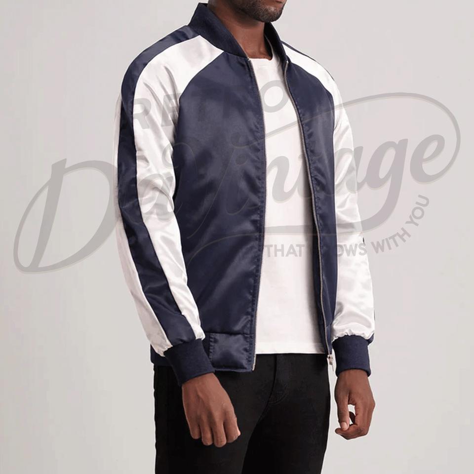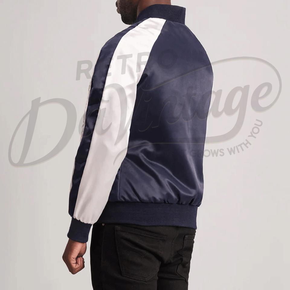 Chaqueta Varsity Azul Marino Personalizada para Hombre, Chaqueta Bomber de Satén con Mangas Raglán Blancas, Chaqueta de Béisbol Universitaria Ligera y Ajustada