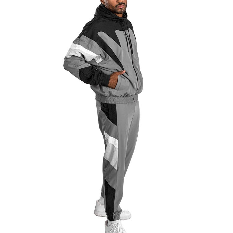 Conjuntos de Jogger de poliéster personalizados para hombre, chándal cortavientos de dos piezas transpirable con chaqueta de nailon con cremallera Patchwork