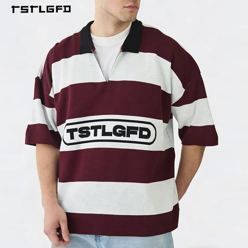 Camiseta Personalizada de Manga Corta para Hombre, Cuello en V, Hombros Caídos, Estilo Oversize, Cuello Polo, Rayas, Streetwear, OEM, ODM, Envío Rápido