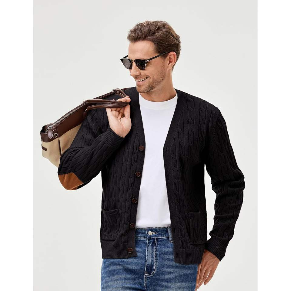Suéter de punto de cable personalizado para hombre con cuello en V bordado con botones de mohair cálido de invierno con cierre de cremallera y bolsillos