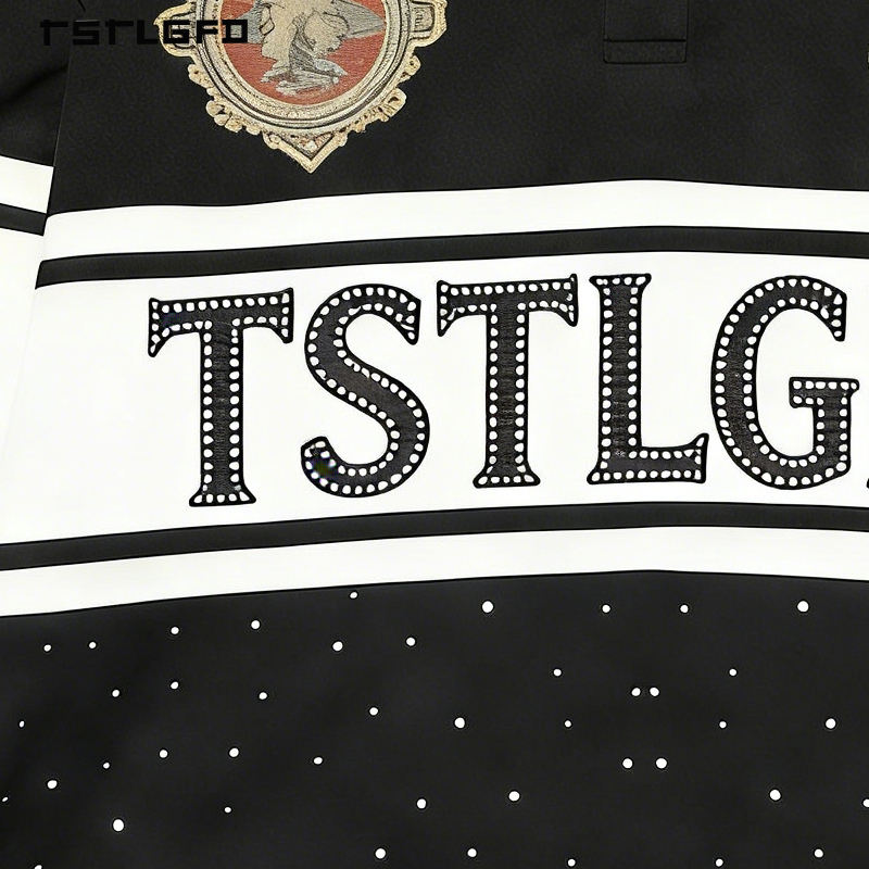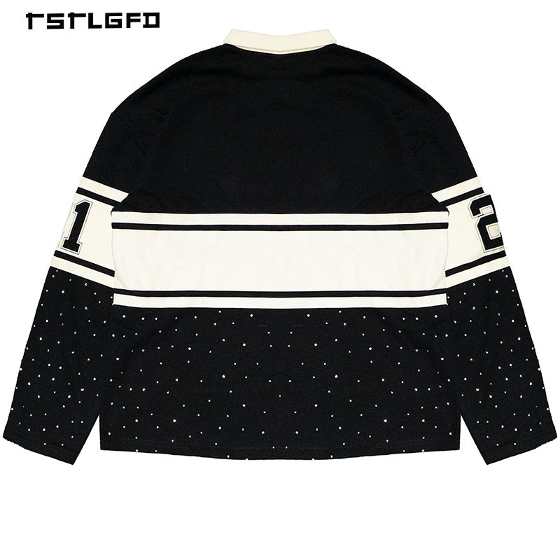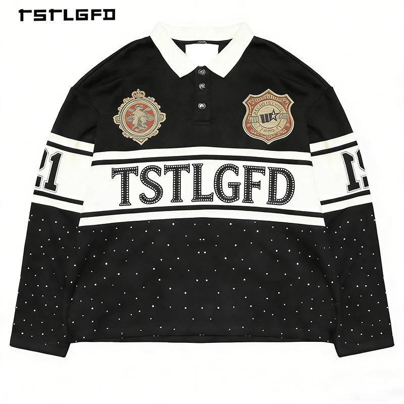 Camiseta personalizada para hombre con parche bordado desgastado, 100% algodón, con pedrería, corte holgado, manga larga.