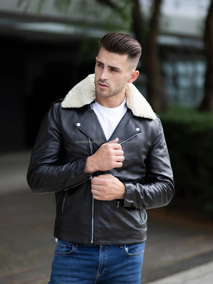 Chaqueta de cuero negro genuino personalizada para hombre, Cuello acolchado de invierno, clásica con función de secado rápido, tela de lona, colocación del logotipo frontal