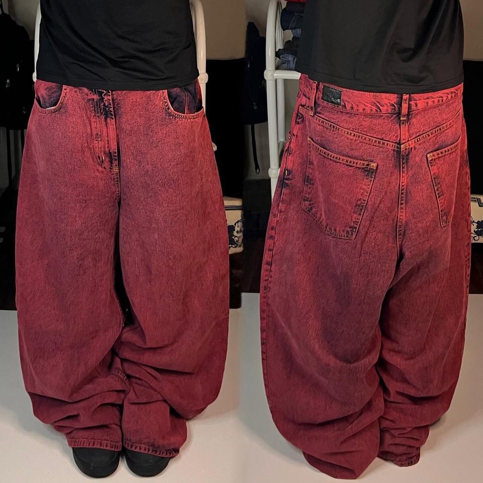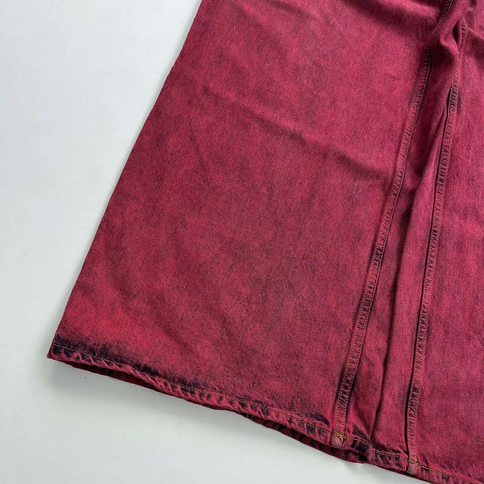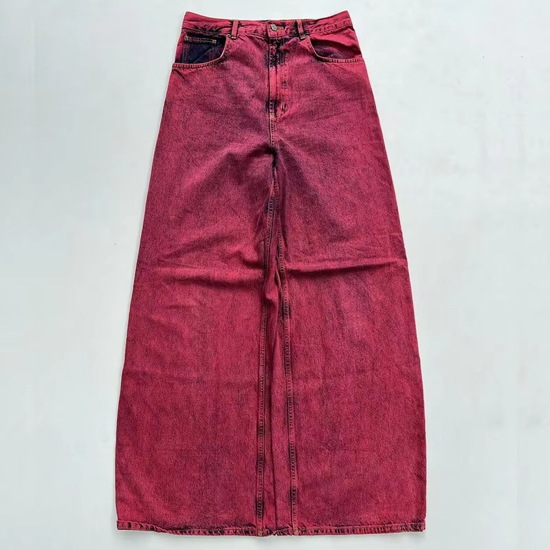 Pantalones vaqueros rojos de mezclilla de peso pesado de alta calidad para hombre, pantalones vaqueros de talla grande de tiro bajo con pintura en aerosol, lavado con piedra, ropa de calle apilada en 3D