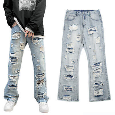 Pantalones vaqueros casuales de hombre personalizados, de punto, con lavado químico, de cintura media, con diseño desgastado y rotos, de corte regular y cierre de cremallera