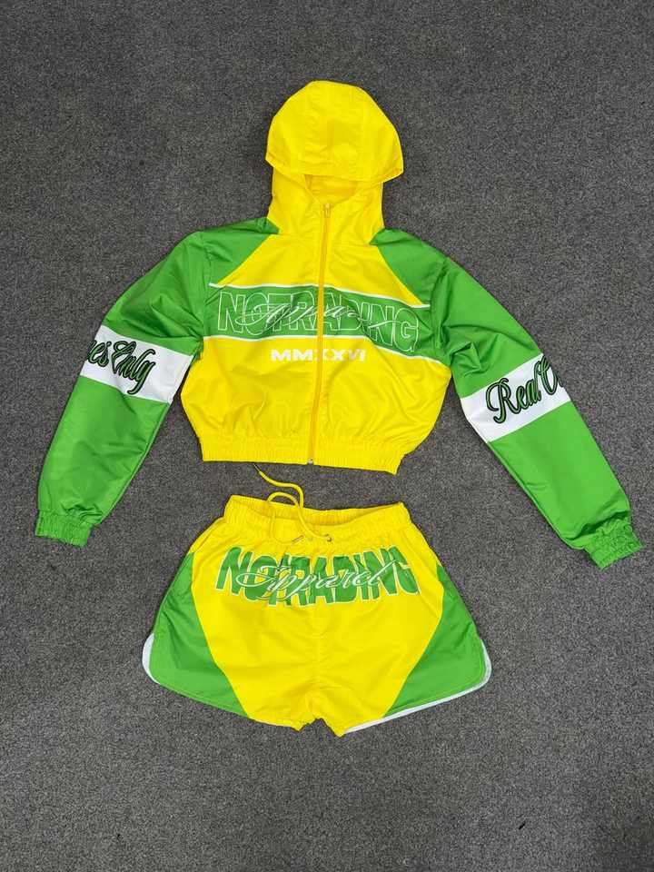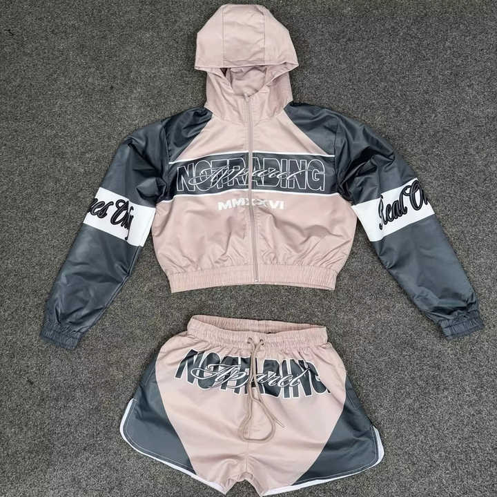 Conjunto de pantalones cortos personalizados para hombre, chaqueta cortavientos reflectante con cremallera, conjunto con logotipo bordado, chándal de nailon impermeable con bloques de color para mujer