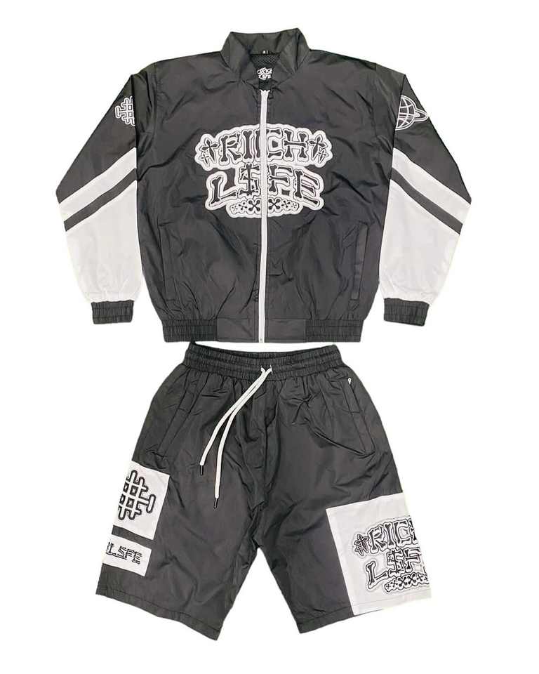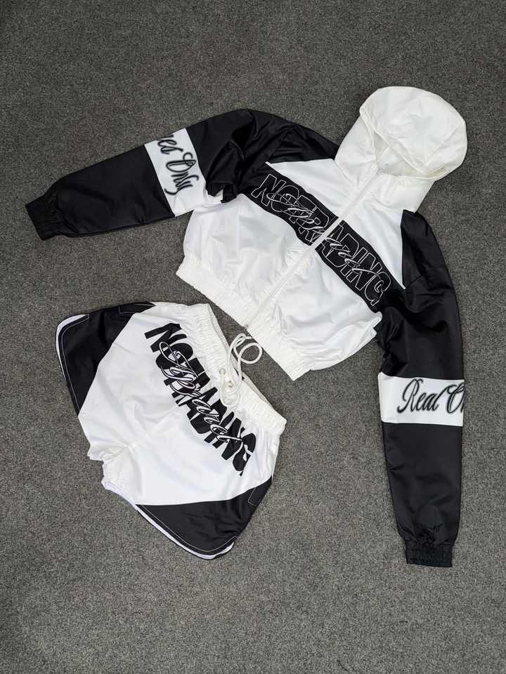 Conjunto de pantalones cortos personalizados para hombre, chaqueta cortavientos reflectante con cremallera, conjunto con logotipo bordado, chándal de nailon impermeable con bloques de color para mujer