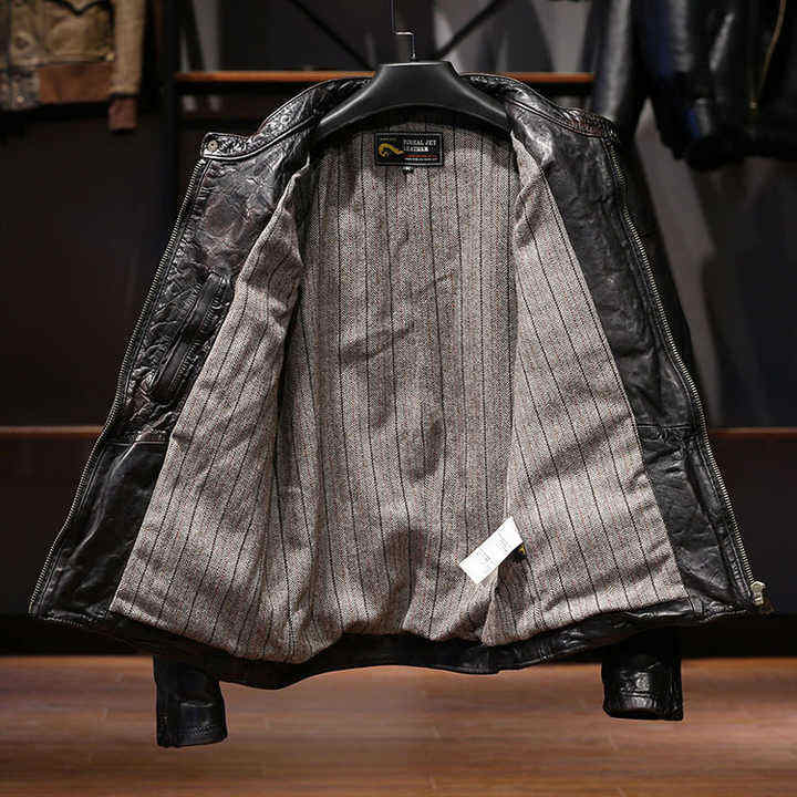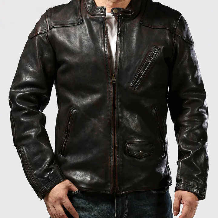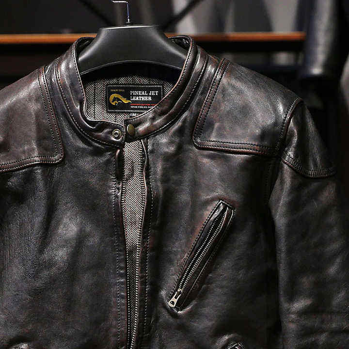 Chaqueta de moto de cuero de caballo con patrón sólido personalizado para hombre, cuello levantado, piel de oveja genuina con pliegues, teñido liso