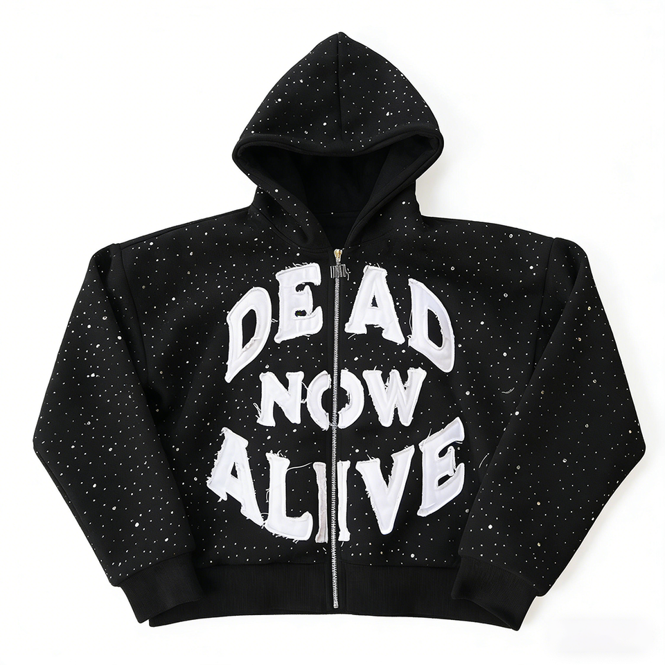 Sudadera con capucha personalizada para hombre, con lavado ácido completo, apliques de purpurina, cremallera, pedrería y bordado 3D, estilo streetwear, 430 g/m²