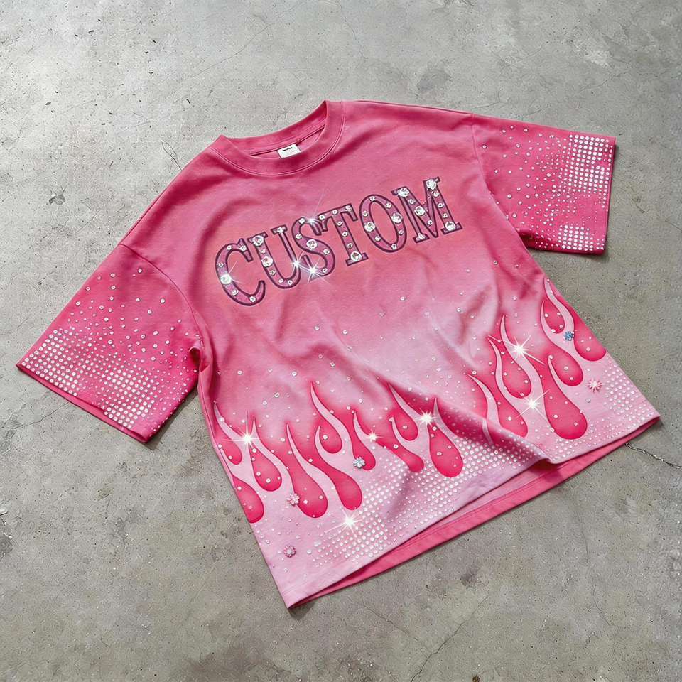 Camiseta Personalizada para Hombre, Estilo Retro, Corte Holgado, Cuello Redondo, Verano, Efecto Desgastado por el Sol, con Brillo y Pedrería, Manga Corta