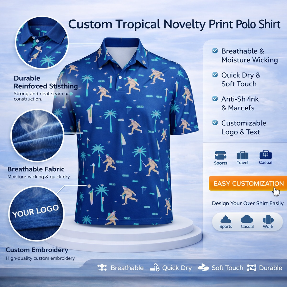 Polo de Golf Ligero para Hombre con Estampado Tropical Completo, Personalizado con Logotipo
