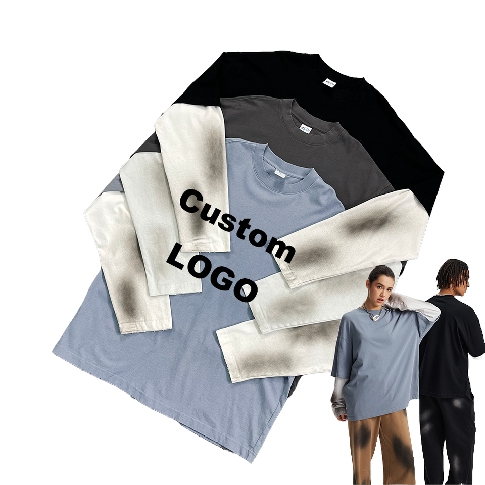 Camiseta de Manga Larga de Dos Piezas para Hombre, Personalizada, de Doble Capa, de Alta Calidad, 275 g/m², Algodón Grueso, Holgada, Lavada